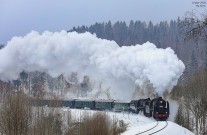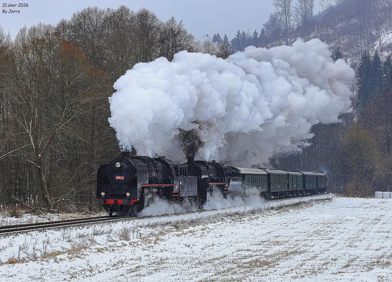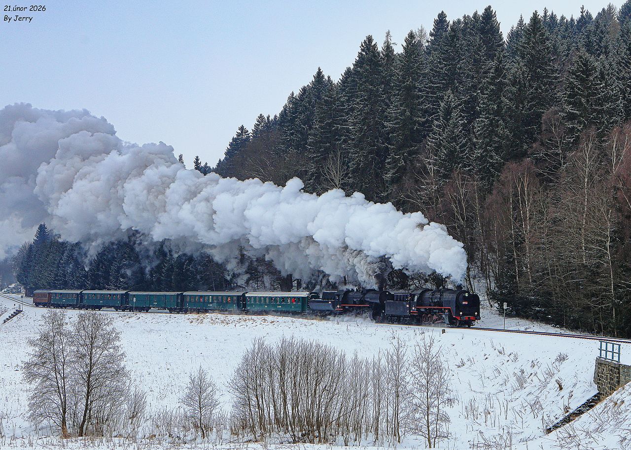 Cestou vlak nabral asi 80minut zpoždění, přeci jen se v zimě nejede tak jako v létě a bohužel k tomu přispěla i kvalita uhlí,které se spékalo a tak byl ve stanici Ostružná opět delší pobyt, z důvodu křižovaní s pravidelným vlakem. Díky tomu tady máme dálší snímek,tentokrát krátce před vrcholovým bodem nedaleko Ramzové (21.2.2026)