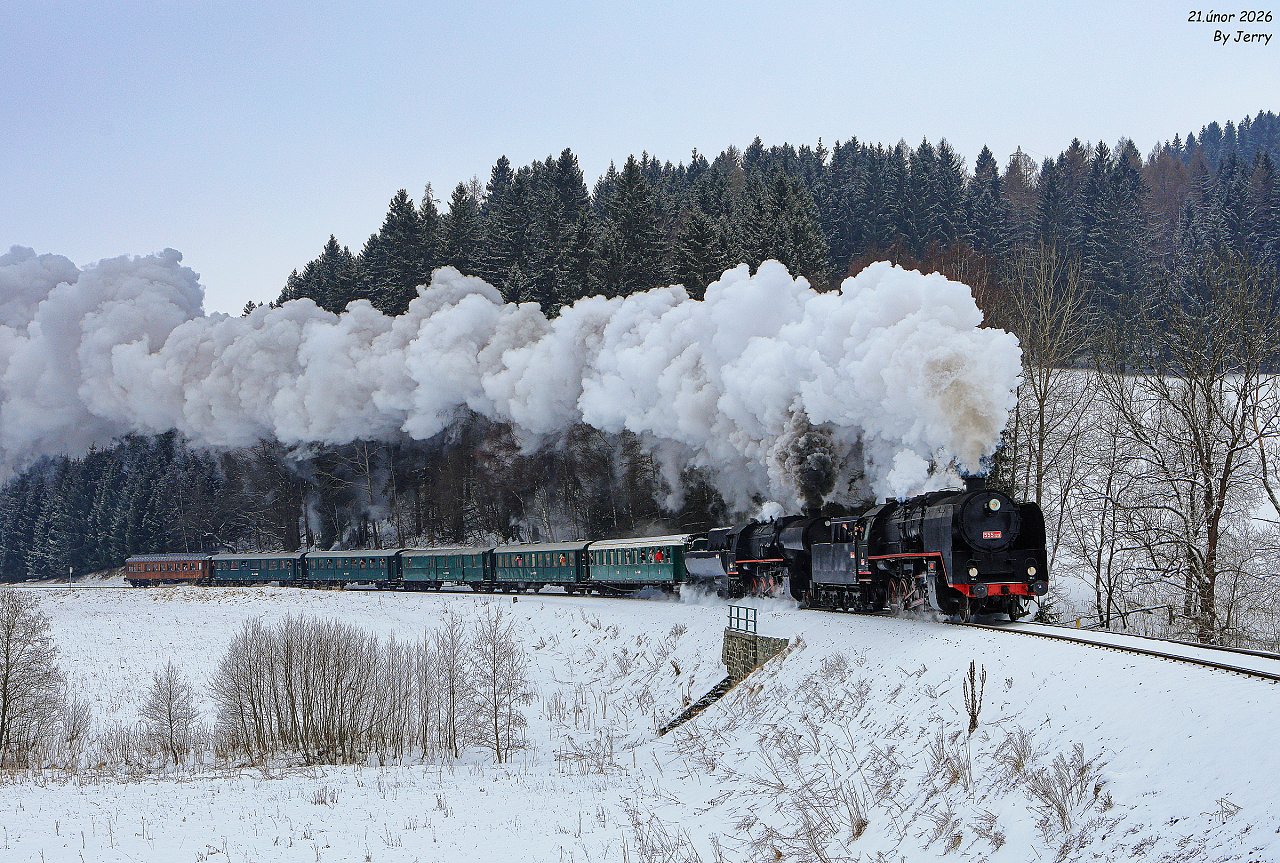 Po dlouhých letech zimní akce uspořádaná v jiný než Mikulášský termín, kdy na konci měsíce února vyrazila vstříc Jeseníkům dvojice nákladních parních lokomotiv v čele zvl.veřejného rychlíku. Na snímku vlak zachycený v lehké sněhové přeháňce po úvrati v Hanušovicích v mezistaničním úseku Potůčník -Jindřichov na Moravě (21.2.2026)