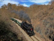 Po dlouhých letech zimní akce uspořádaná v jiný než Mikulášský termín, kdy na konci měsíce února vyrazila vstříc Jeseníkům dvojice nákladních parních lokomotiv v čele zvl.veřejného rychlíku. Na snímku vlak zachycený v lehké sněhové přeháňce po úvrati v Hanušovicích v mezistaničním úseku Potůčník -Jindřichov na Moravě