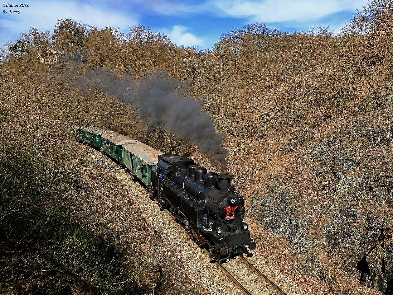Opět po roce byly v Ústeckém kraji vypraveny zvláštní parní vlaky na Švestkové dráze, dráze spojující Most a Lovosice. Na snímku s ranním Os10701 stoupá k bývalé zastávce Skršín "Bulík" NTM